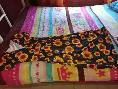 Vestido largo con estampado de girasoles. Vestido color negro con girasoles amarillos, es largo y cuenta con manga corta y escote en V, en la parte de la cintura cuenta con un poco de resorte, el vestido es muy fresco y muy lindo