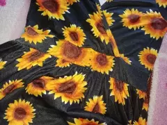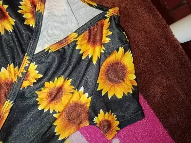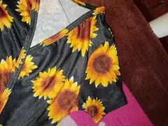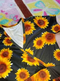 Vestido color negro con girasoles amarillos, es largo y cuenta con manga corta y escote en V, en la parte de la cintura cuenta con un poco de resorte, el vestido es muy fresco y muy lindo
