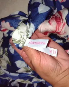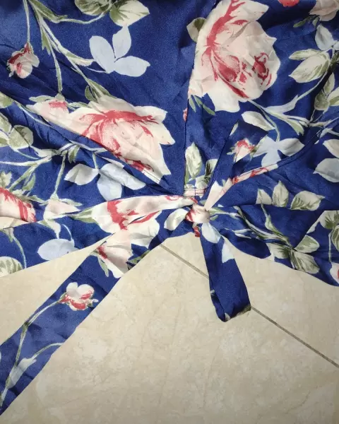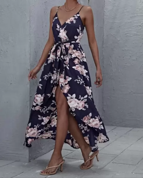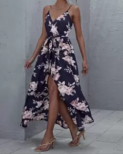 Vestido largo corte irregular estampado. Azul marino con estampado de flores blancas y beige
