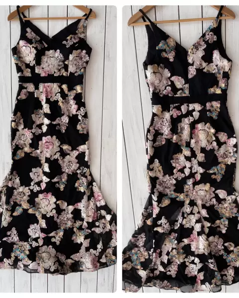 Talla: 8 Medidas: 39.5 cm axila (da a unos centímetros más), 35 cm cintura, 126 cm de largo tomados desde el cierre.Vestido largo corte sirena con tirantes, cierre invisible, forro y copas no removibles.Ver medidas por favor.