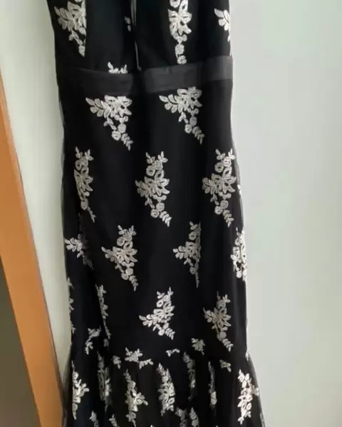 Vestido largo de fiesta negro. Transparencias en la parte de arriba, talla 6, excelente estado