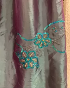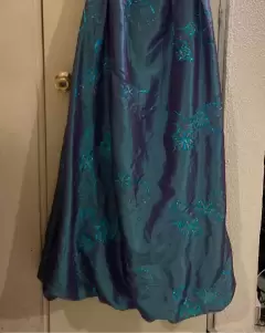 Vestido largo de fiesta tornasol. Vestido azul tornasol con flores de lentejuela bordadas, talla S, straples, largo