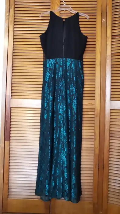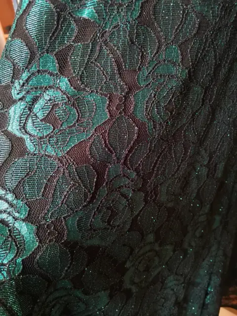 Vestido largo de noche, parte alta negra, baja de encaje negro con verde.Marca: Rue de la paixTalla 10