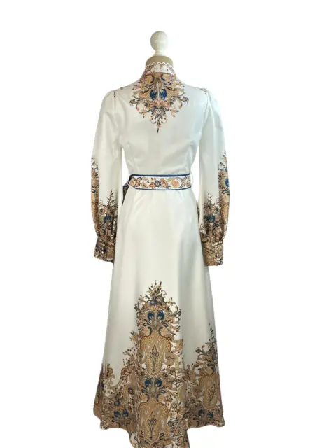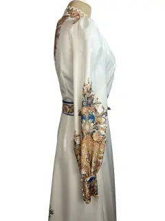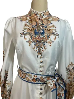 Vestido Largo Estilo Boho-Chic con Detalles BarrocosEste vestido largo es una pieza única que combina elegancia clásica con un toque moderno de inspiración boho. Con un estampado barroco en tonos dorados y azules, detalles delicados en la parte frontal y una cintura ceñida con cinturón a juego, es perfecto para cualquier ocasión especial.Color: Blanco crema con estampado dorado y azul.Corte: Corte A con mangas largas y abotonado en la parte delantera.Ideal para eventos formales o casuales con un toque sofisticado.Este vestido es perfecto para quienes buscan un look refinado con un aire vintage. ¡Añádelo a tu armario y destaca con estilo en cualquier ocasión!