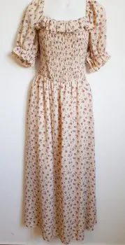 Vestido beige con flores lilas, elastico en la parte frontal, tiene forro. Mide 44cm de axila a axila