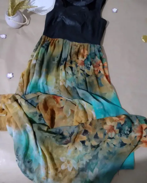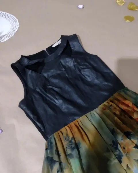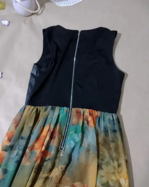 Hermoso vestido largo, con diseño floral en toda la falda, la parte del pecho es polipiel con bonito corte. En perfecto estado
