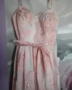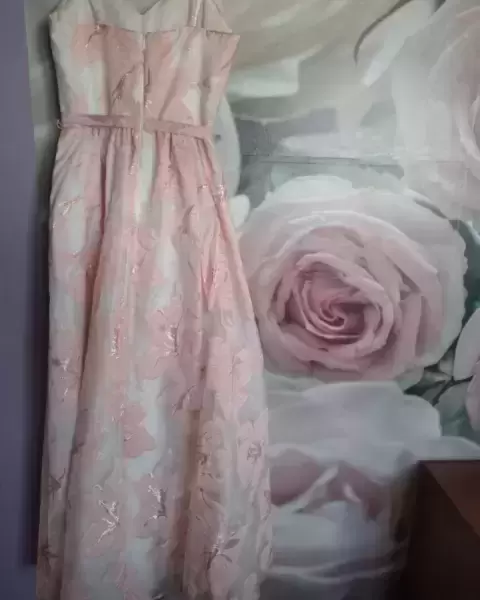 Hermoso vestido de flores rosadas con detalles dorados claros, strapless con tirantes desmontables talla 10, y medidas de cintura 37 cm, de axila axila 43 cm y la falda de un largo de 100 cm. Todo forrado.