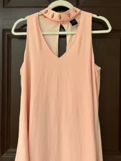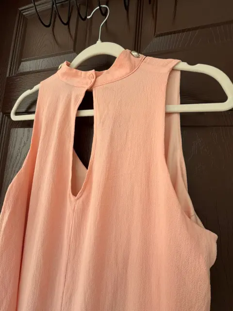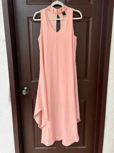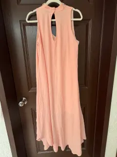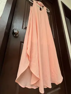 Vestido largo de manga corta en color tipo durazno, con fondo, detalles plateados en la parte del cuello de la marca Wrapper, talla L (tiene una ligera mancha en la parte de enfrente)
