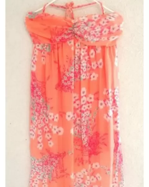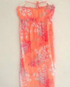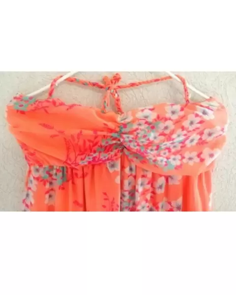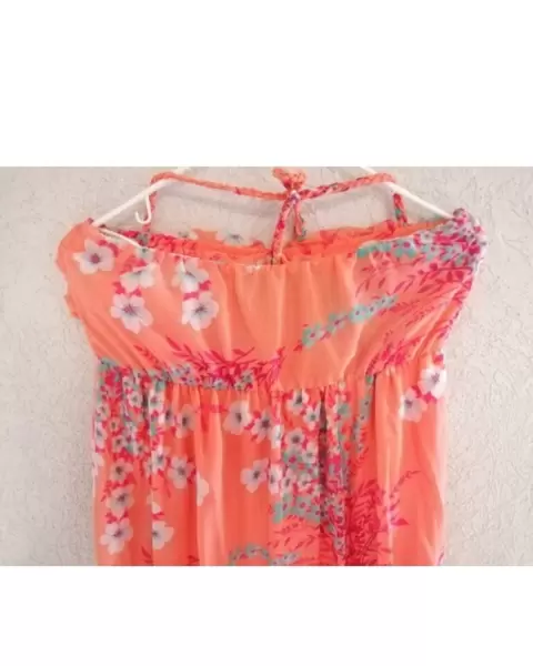 Está hermosisimo 😍 es color melón con estampado de flores, es strapples así que si tienes busto te va muy bien. Tiene fondo del mismo tono del vestido y llega a media pierna.Medidas:39 cm de axila a axila y estira 7cm más36cm abajo del busto y estira 7cm más40cm de cintura y estira a 60cm130cm de largo