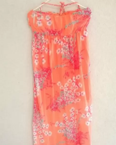Vestido largo melocotón Strapples 💝💫. Está hermosisimo 😍 es color melón con estampado de flores, es strapples así que si tienes busto te va muy bien. Tiene fondo del mismo tono del vestido y llega a media pierna.Medidas:39 cm de axila a axila y estira 7cm más36cm abajo del busto y estira 7cm más40cm de cintura y estira a 60cm130cm de largo