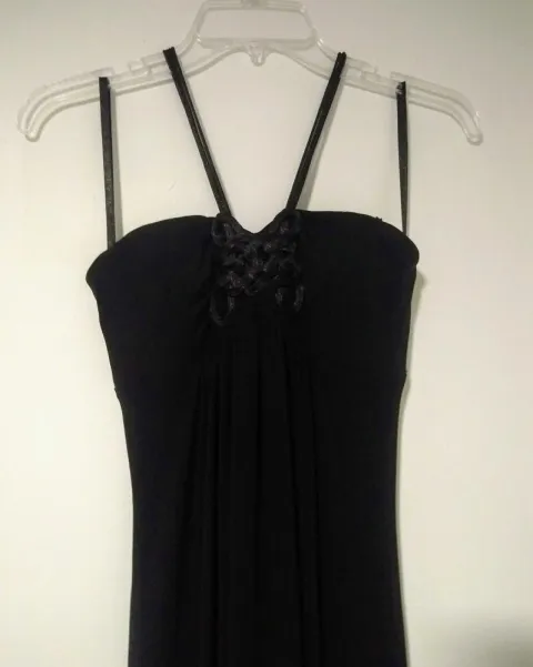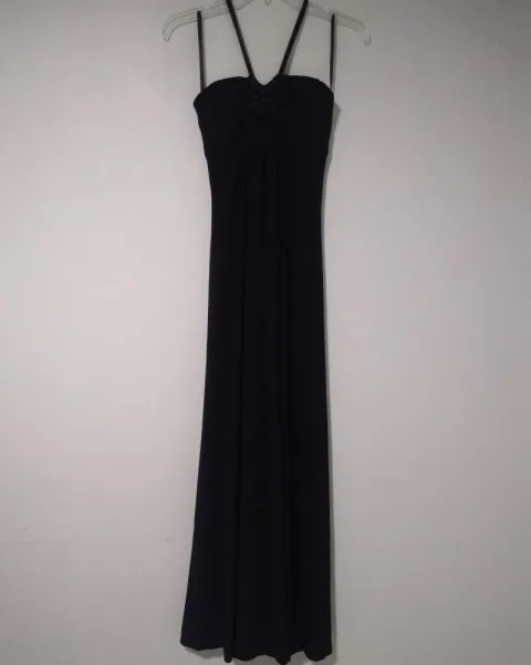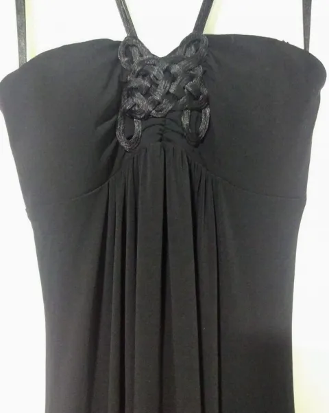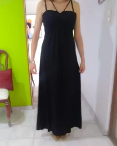 Elegante Vestido Largo corte Princesa color Negro, tela de afuera y forro strech, de poliéster, tiene muy bonita caída, el cuello es de tiritas, tiene cierre en la espalda, Talla Chica es como talla 7 o 5, ancho Axila=38cm, ancho Cintura=43cm, ancho Cadera=62cm, Largo=152cm, Te regalo $100 con mi código de descuento si es tu primera compra iuNisj3oSQ