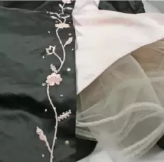 Vestido largo negro con rosa, con flores bordas en color rosa, tiene forro y tul, está abierto del frente en la parte de atrás tiene cordón para ajustarse, tiene tirantes delgados