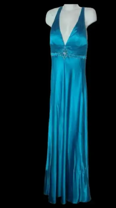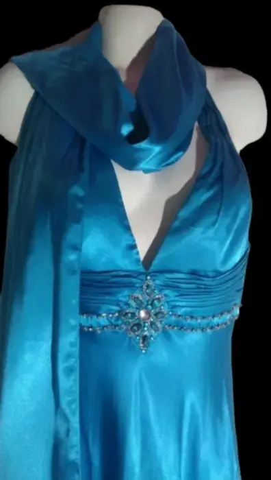 Elegante vestido azul con escote tirantes y aplicaciones de pedrería tela poliéster medidas 1.20 de largo 34 cms de cintura único detalle un pequeño jalón en la parte de abajo que casi no se nota se observa en la última foto incluye pashmina