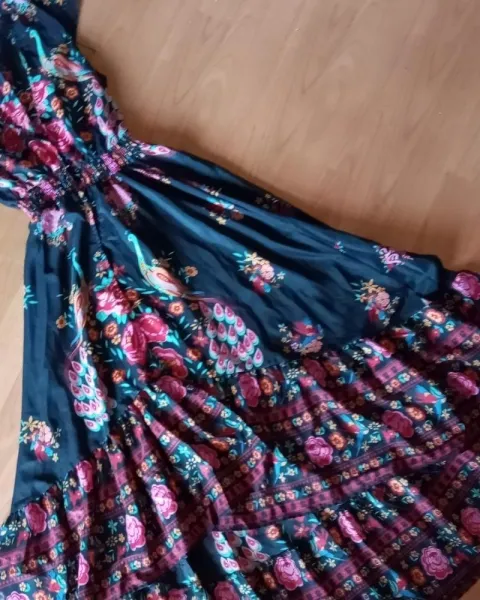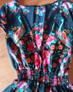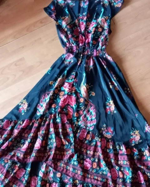 Vestido largo primaveral. El único detalle es que le hace falta el primer botón de arriba hacia abajo, fuera de eso sin detalle esas corta de la parte de adelante que de atrás
