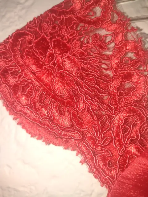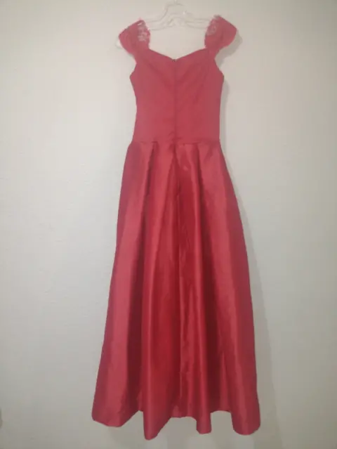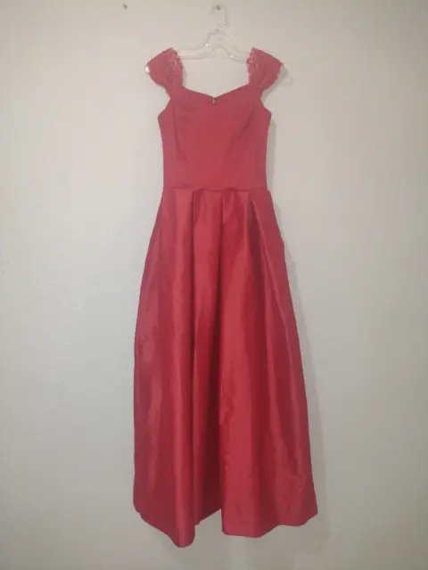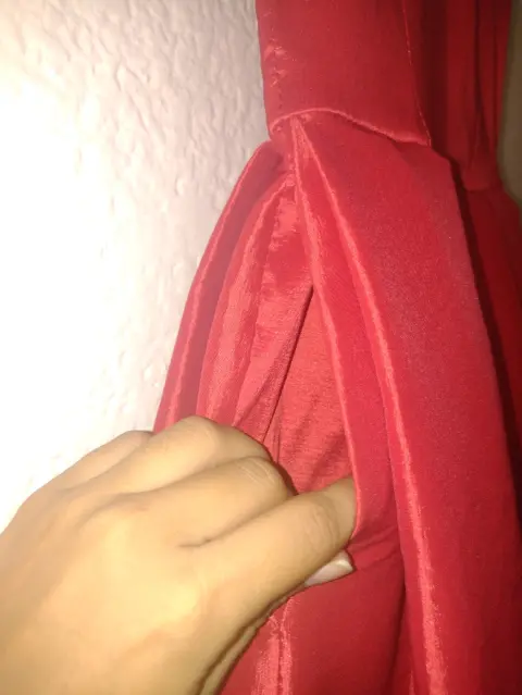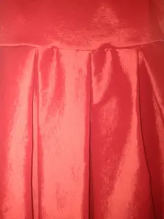 Vestido largo rojo. Vestido de noche. Tela satinada. Falda con tablones para dar mayor volumen. Tirantes de encaje. Se pueden acomodar para mostrar el hombro. Tiene bolsillos.