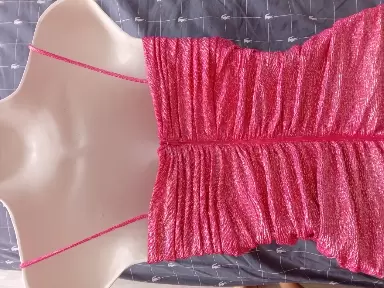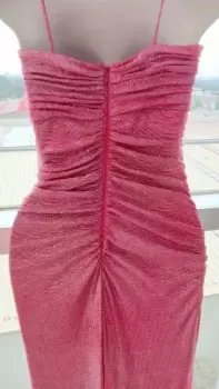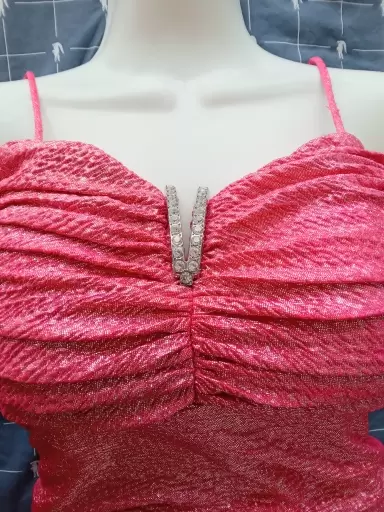 Deslumbrante vestido largo rosa con detalles plateados, escote con brillantes y detalles a los costados que favorecen mucho la silueta. La tela es perfecta para la noche o para un evento a mediodía.