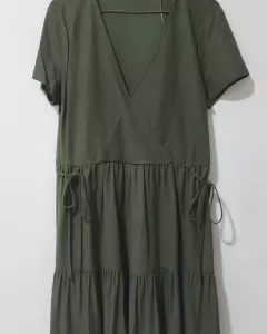 Bonito vestido tono verde militar con coquetos listones a los lado de adorno, asi como doble plisado dando un toque coqueto y femenino
