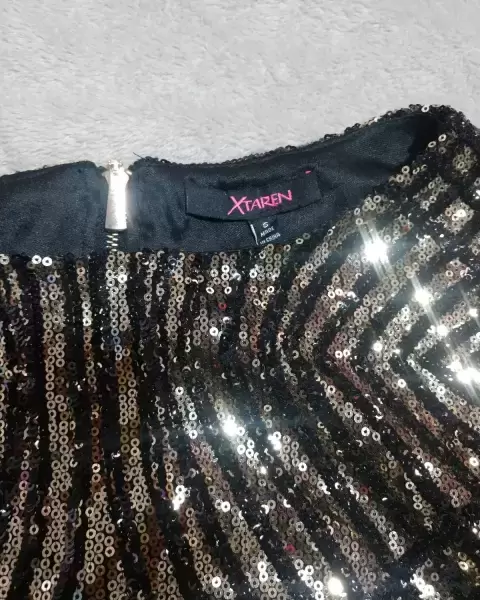 Vestido lentejuela. Vestido de lentejuelas negro con dorado, manga larga, sin ningún detalle
