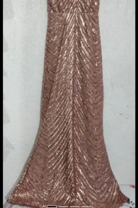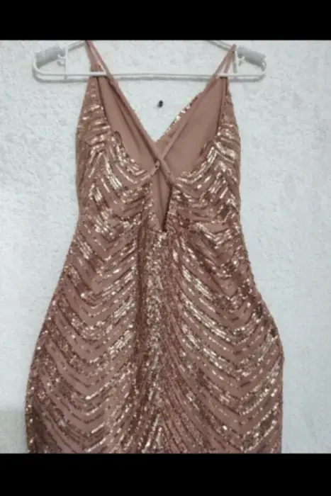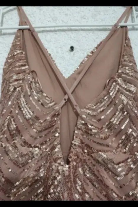Vestido con lentejuelas, color oro rosado, escote espalda y tirantes ajustables. Tela que estira y se amolda al cuerpo