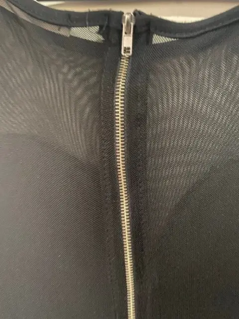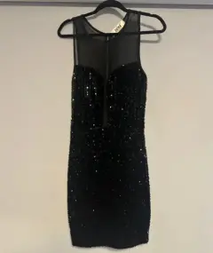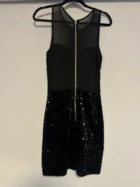 Vestido corto de fiesta con lentejuelas en color negro, talla mediano. Con transparencia en la parte superior en el frente y transparente en la parte de la espalda. La tela estira y tiene zipper en la parte de atrás.