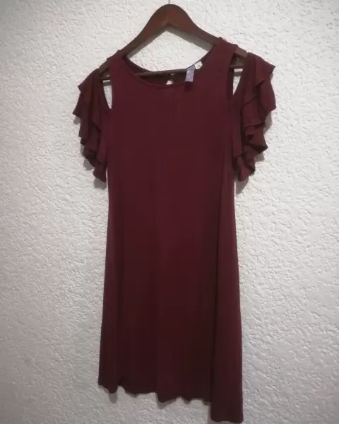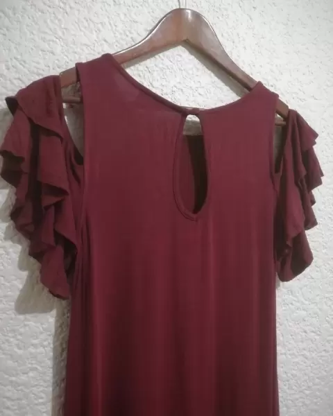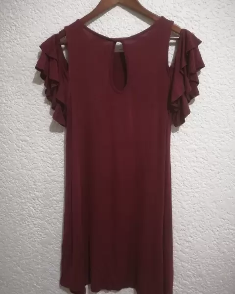 Vestido ligero con hombros descubiertos. Color vinoTalla XS, queda a Chico tambiénLa prenda estira, la tela es delgaditaMedidasHombro 32 cmAxila 42 cmLargo desde hombro 84 cmMedidas sin estirar la prenda y de la parte del frente