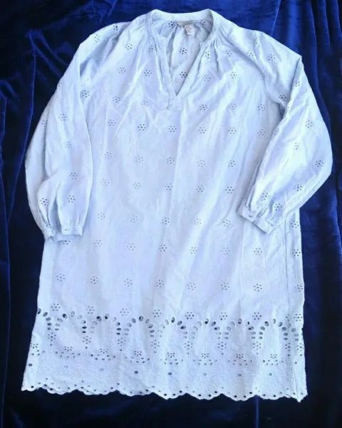 Dice talla xs pero queda mejor a talla L ya que el vestido viene amplio, pero se ajusta con el cinto y puede quedar a xs. Es azul pastel. No trae forro por dentro pero no transparenta, no estira.Medidas:Alto total: 100 cmAxila a axila: 63 cmHombro a hombro: 42 cmEl cinto mide 186 cmDetalle: se despinto de una esquina en el encaje de abajo, casi no se nota.*se envia en caja reciclada*