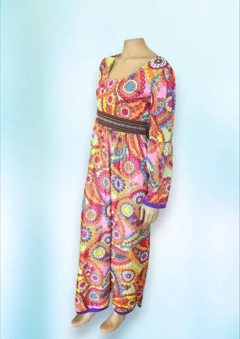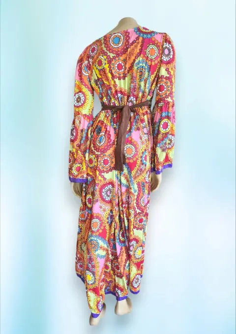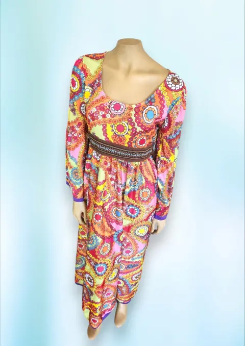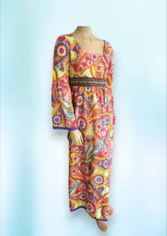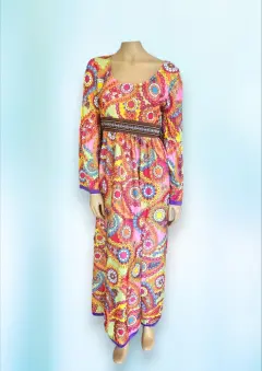 Vestido Lijero Gitano Maxy, unitarian, multicolor con estampado de Flores, cuello Redondo, listones para ajustar cintura, manga larga ancha, Heche a Mano con tela de algodon, mide 45cm de hombro a hombro, 44cm de axila a axila, 34cm de cintura, 67cm de Manga con 140cm de largo, ideal para tu disfras de gitana en Las proximal Fiestas en buen estado cosmetico