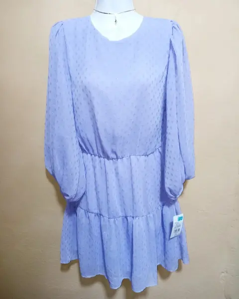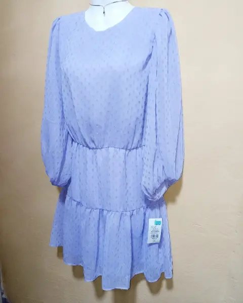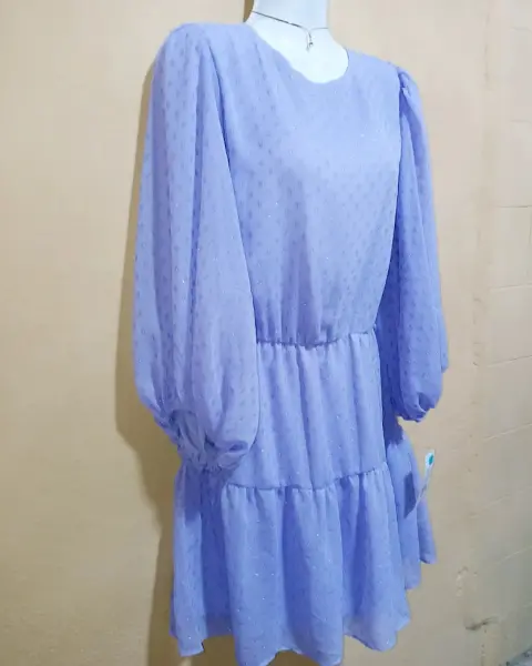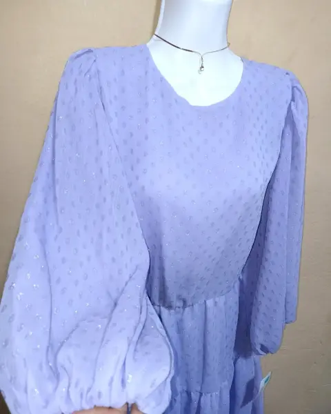 Hermoso vestido lila con olanes ✨Tiene fondo, es corte A, mangas aglobadas y tiene ligero brillo Totalmente nuevo con etiqueta original