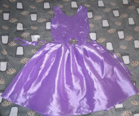 vestido lila de talla chica, corto, con resorte desde la cintura, adornado con piedras y lazo con accesorio en forma de flor