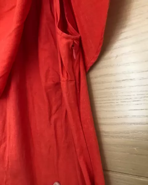 Vestido corto de Lino color Naranja, con Olán al frente, que puede bajarse a los hombros, marca life Style talla G