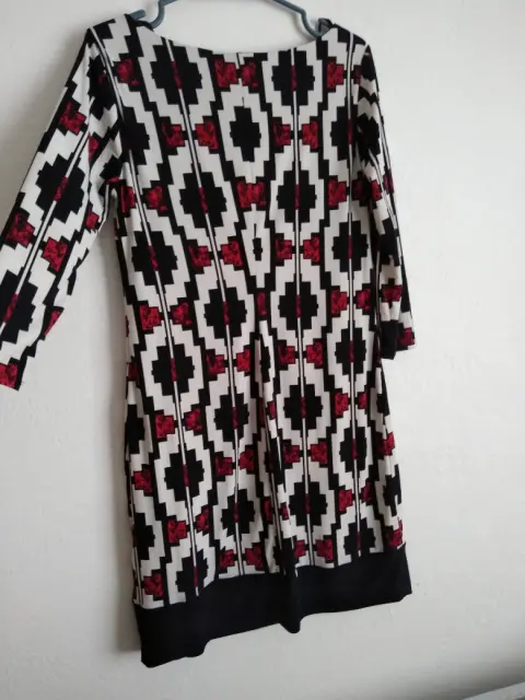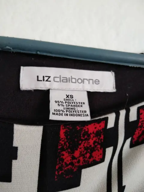 Vestido Liz Claiborne. Bonito vestido de figuras spandex en color negro, blanco y rojo con fondo negro, dice talla XS pero viene amplia y además estira la tela por lo que puede ser talla S también, la tela es poliéster, manga 3/4.