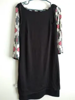 Bonito vestido de figuras spandex en color negro, blanco y rojo con fondo negro, dice talla XS pero viene amplia y además estira la tela por lo que puede ser talla S también, la tela es poliéster, manga 3/4.