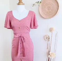 Hermoso Vestido rosacierre espaldalunares blancos, tiene en manga mariposa cinturón de telaTalla MPecho 86-98 cmCintura 76-84cmLargo 103cm100 % poliéster