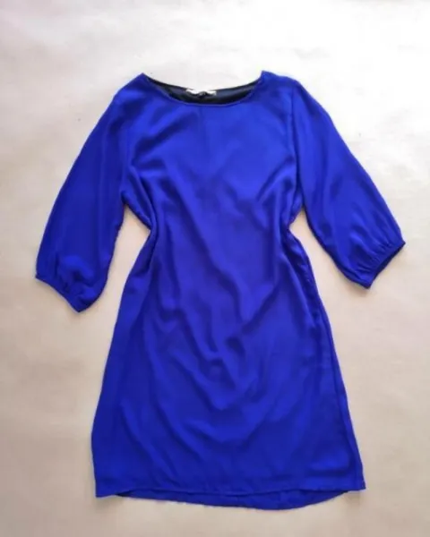 Vestido manga 3/4 azul. El único detalle es que en la parte de atrás tiene las costuras un poco abiertas, casi no se nota, es un error de fabricaMedidas en plano:Hombro a hombro 38cmAxila a axila 46cmLargo 86cm