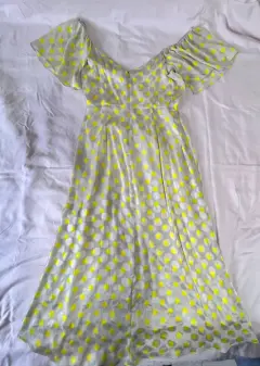 Maxi deress, manga corta, estampado con bolitas amarillas y contraste beige
