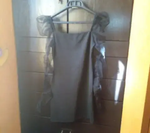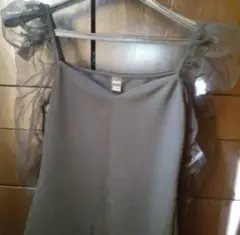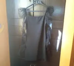 Vestido negro corto ,manca larga de tul plisada el corte del busto es en corazon y la tela es muy comoda y ajusta estira