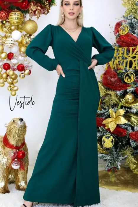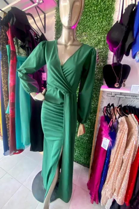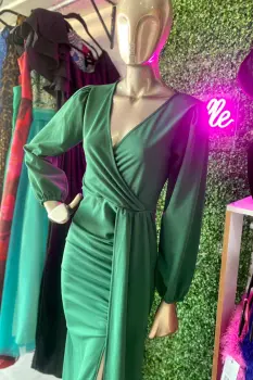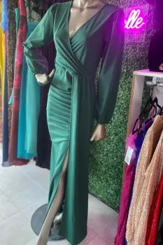 Vestido Manga Larga Verde con abertura de noche. Esta hermoso, es como verde esmeralda. Luce muy bonito. Tiene abertura en la pierna. Es unitalla abarca a una talla 5 a 7