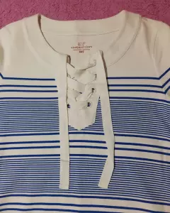 Vestido manga tres cuartos, color blanco con rayas horizontales azules y tejido de agujeta y la parte del pecho.