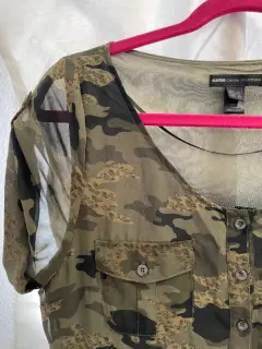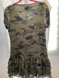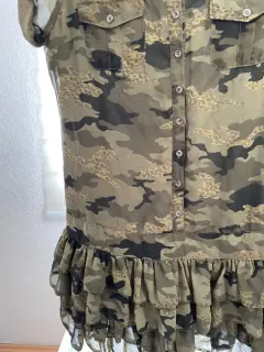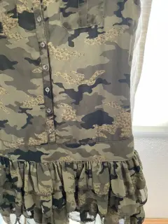Mango Vestido verde militar Color verde militarTalla EGMaterial tela suave Cuello redondo Mangas corta Olanes en la falda Cintura ancha Estado Usado buenas condiciones Precio 250Medidas en centímetros