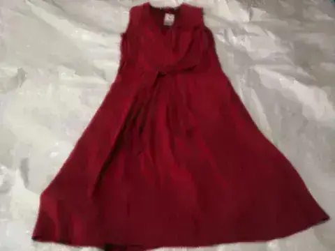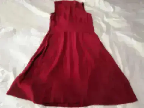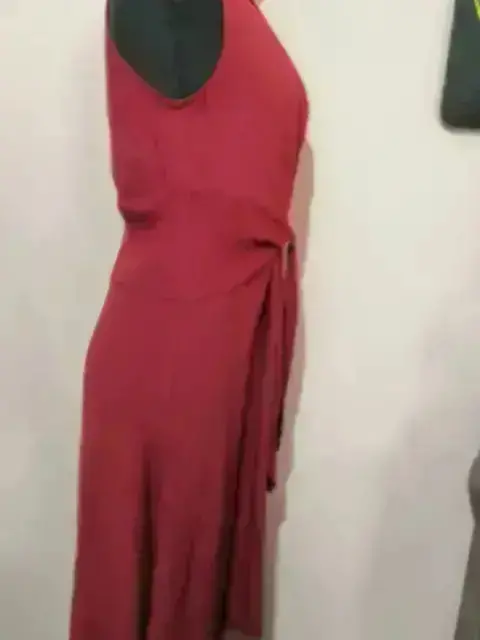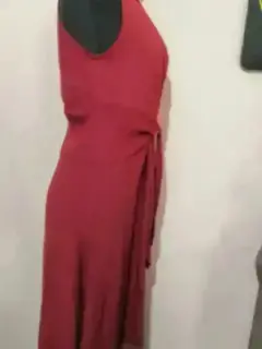 Vestido tono rojo quemado largo midi, talla L da entre talla 32-34 medidas axila a axila 50 CM y largo 100 cm, se ajusta con cierre del costado y con el nudo que trae al frente