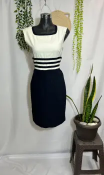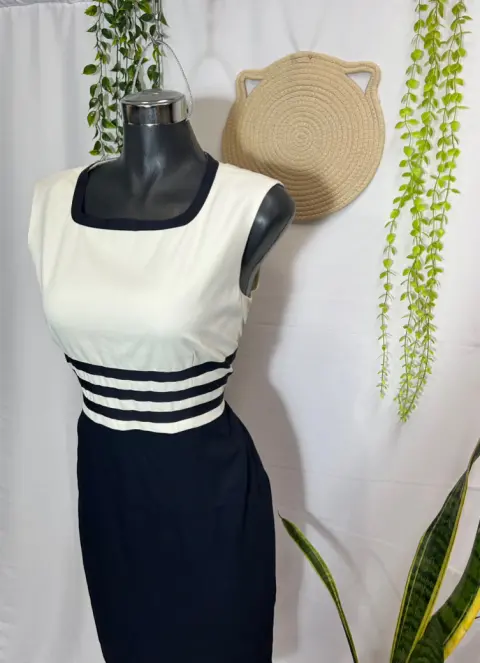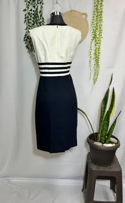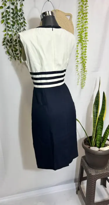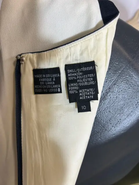 Hermoso vestido estilo marinero, azul marino con beige, marca liz claiborne, talla 10, yo creo que es L, ☘️medidas , hombros 40, axilas 47, largo 96. ☘️🌸B015.🌸