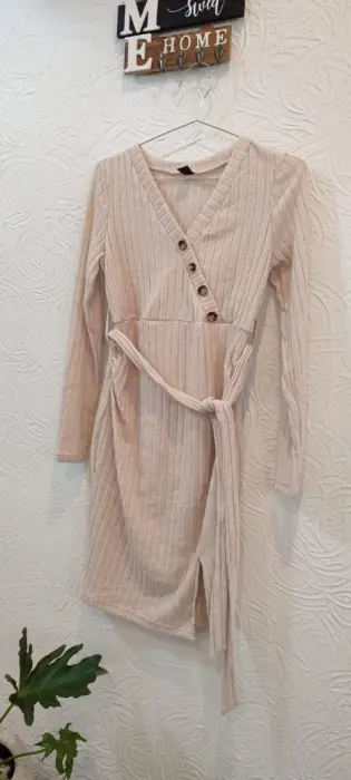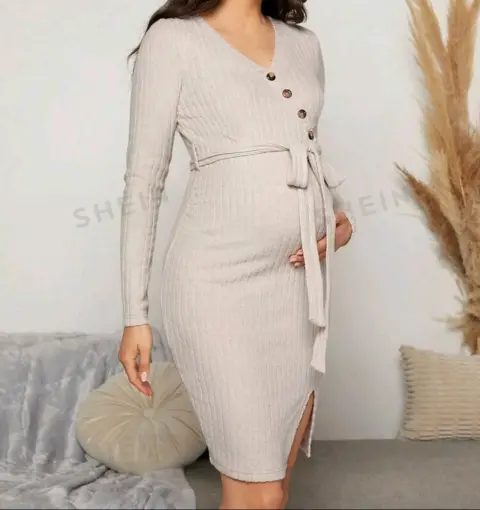 Vestido ajustado de tela suave y ligera, cómodo para los primeros meses de embarazo. Abertura del lado izquierdo de la pierna, botones delanteros y cinturón.