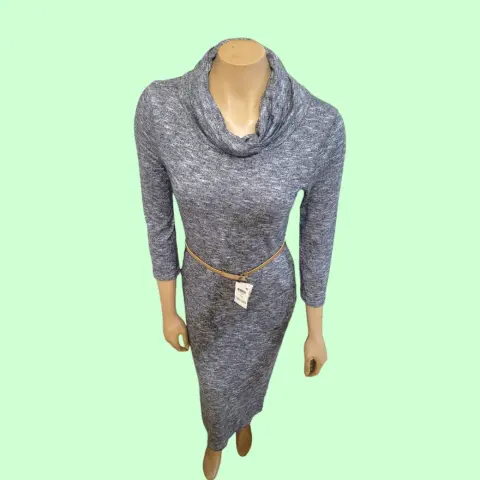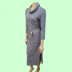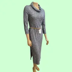 Vestido Maxy Forever 21, talla grande, color gris claro, cuello de tortuga, manga 3/4, habierta mediana a un lado bajo, hecho de poliéster, rayón y elastano, estilo slip-on, mide 38cm de hombro a hombro, 19cm de largo en cuello, 39cm de axila a axila, 38cm de cintura con pretinas para cinturon (no lo incluye la venta), 118cm de largo del hombro hacia abajo con abertura de 32cm en parte baja, usado