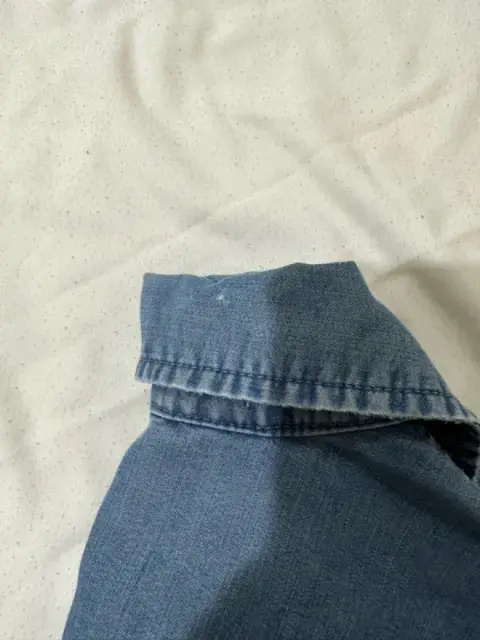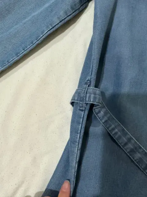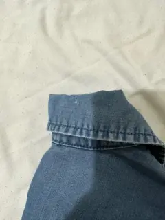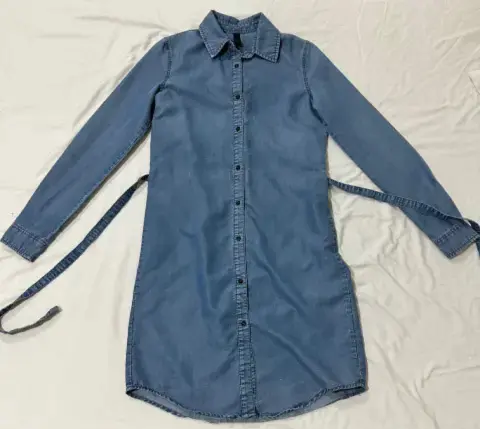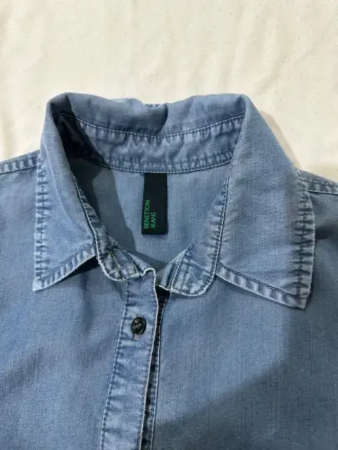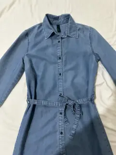 Vestido de mezclilla Marca Benetton, con cinturón de la misma tela para marcar la cintura, el largo es arriba de la rodilla.