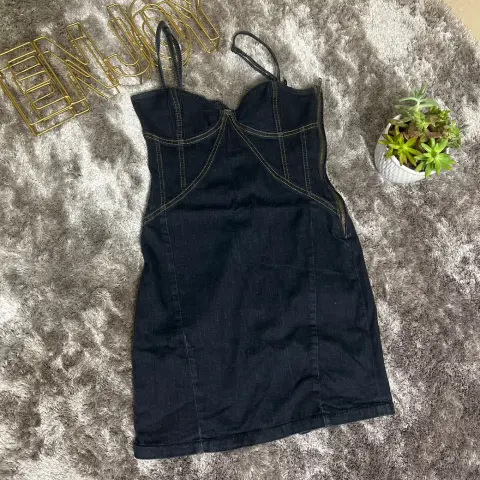 Vestido mezclilla corto. Vestido de mezclilla azul marino con cierre lateral, tirantes ajustables. Dice talla mediana pero viene chico, nuevo sin ningún detalle, queda Perfecto a xs o s