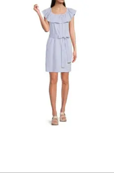 MICHAEL Michael Kors Vestido de cintura con lazo y manga corta con cuello cuadrado y volantes a rayas con bolsas alos lados las primeras dos imágenes son ilustrativas cintura 36cm hombro a hombro 39 cm cadera 47 cm