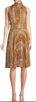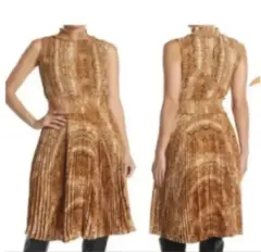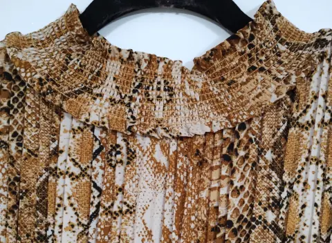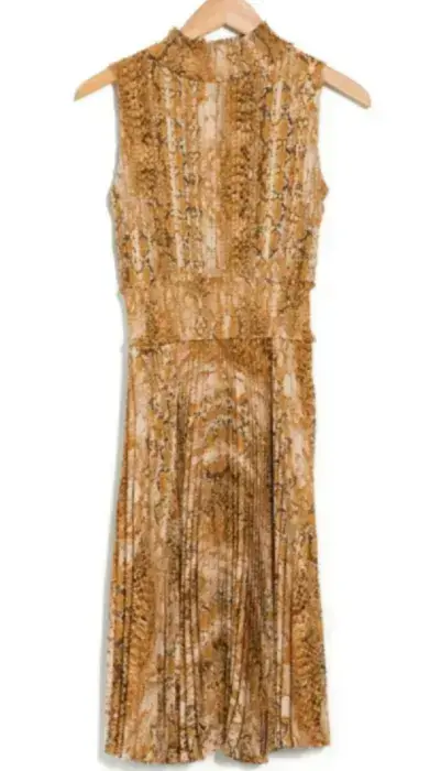 Vestido midi animal print. 🧡HERMOSO modelo midi de la diseñadora Nanette Lepore. Lleno de lindos detalles. Cuello alto con olanes y botones traseros (forrados). La confección del plisado le da movimiento. La cinturilla es elástica y el forro completo. Comodísimo y fácil de combinar. Es una prenda que vale muchísimo la pena 😊. No lo dejes pasar!