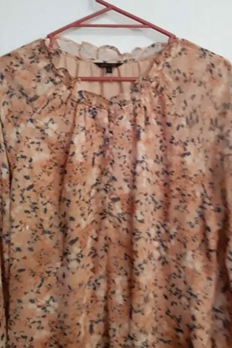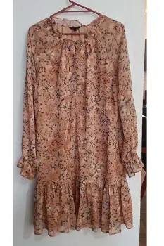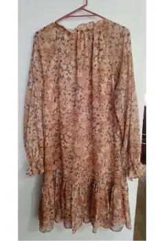 Vestido de tela ligera con motivos florales en varios tonos naranja y verde oscuro cuello redondoEnvío a la brevedadAcepto ofertas