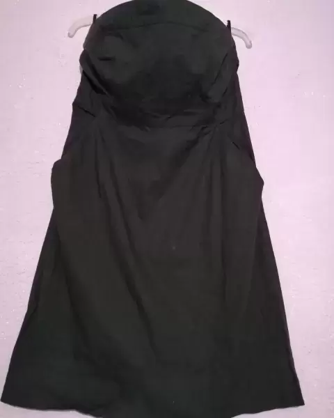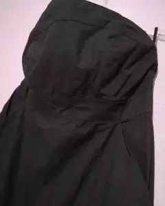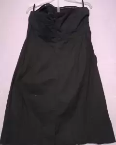 Bonito. Vestido negro con cierre en espalda, cinta que se pega al cuerpo en la parte del pecho, corte princesa, con bolsas a los costados, falda abombada.