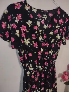 Vestido midi con cinturón de tela. Vestido midi llega a la pantorrilla, color negro con flores rosas, cuello en V y elástico en cintura cuenta con cinturón de tela para un ajuste perfecto las mangas son estilo suelto